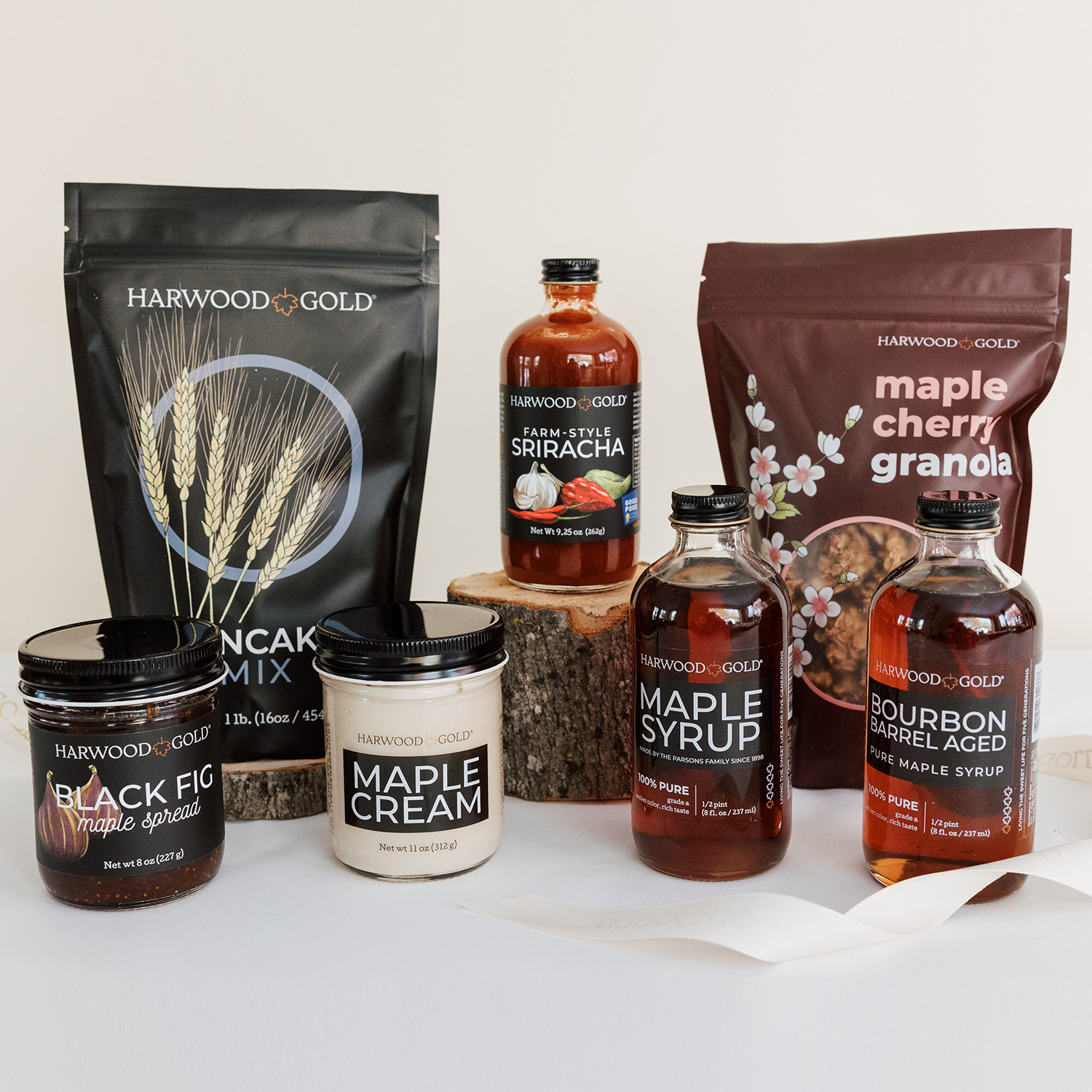 Inside you’ll find the velvety Black Fig Maple Spread, our wildly popular sweet-heat Farm-Style Sriracha, silky Maple Cream, and a bottle of our classic pure Maple Syrup. We’ve also included the fan-favorite Bourbon Barrel Infused Maple Syrup for a rich, smoky twist. To round out the box, there’s our crunchy Maple Cherry Granola and our cozy, ready-for-the-weekend Pancake Mix – perfect partners for a slow morning breakfast.
